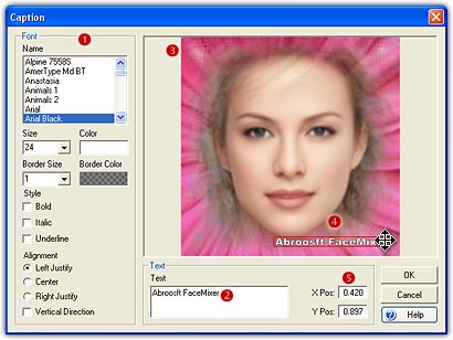 Beginning with version 3.0, you can add text caption on the composite without using any additional software. Click the Caption button on the face mixing panel and the window below will appear.