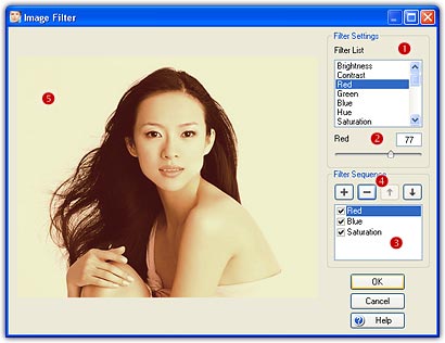 There are total 22 filters where 9 filters for color adjustment (brightness, contrast, red, green, blue, hue, saturation, negative, gray) and 13 for image effect (smooth, bur, Gaussian blur, zoom blur, radial blur, sharpen, emboss, mosaic, oil paint, splash, cylinder, whirl, pinch). The best way to understand these effects is to try them out. Choose effects alone or in various combinations to discover which is best for your purpose.