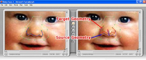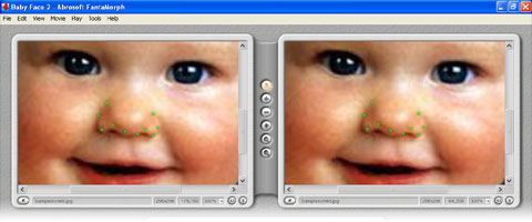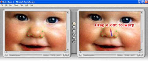 Place one dot on the source image and FantaMorph automatically places another dot on the corresponding coordinates of the target image. For example, if we want to warp the baby's nose, we first add a dot to the area of the nose.