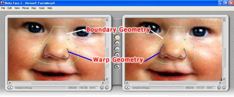 Moving a dot warps the entire image, which may not be the result you desire. It is very important to anchor portions of the image using Boundary Dots. As shown below, we've added dots to the nose as warp geometry (blue line). Then, we added dots around the nose area as a boundary (white line). Note: the lines are for illustration purposes only and won't be displayed in FantaMorph.