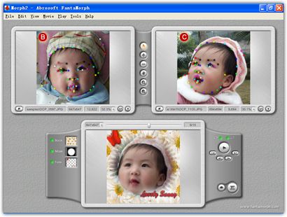 2. Swap source images from Edit menu; now B is "Image1" and A is "Image 2", then import C as "Image 2" and save project as "Morph2". Adjust key dots' position on C; add some new key dots or delete useless key dots if need, then export image sequence to get 15 morphing pictures named Morph201.jpg to Morph215.jpg.