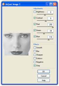 4. There is another useful tool consisting of image adjustment functions. With it, you can adjust brightness, contrast and color balance. It also supports certain special effects such as blur, sharpen, emboss, etc. See more...